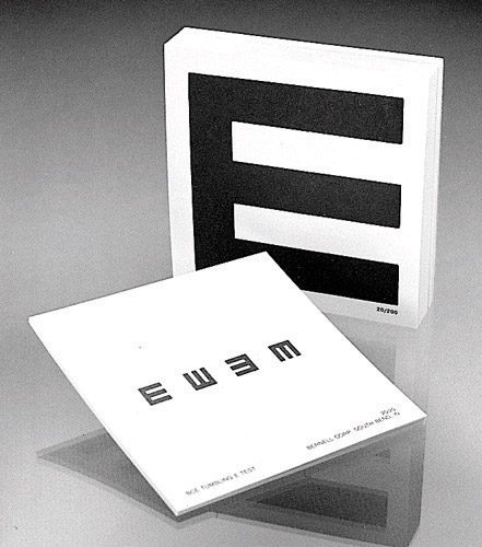 Printed with large 20/200 E on one side and a series of five 20/20 tumbling Es on the other- calibrated to a 20ft. distance. May be used to test and train peripheral awareness.